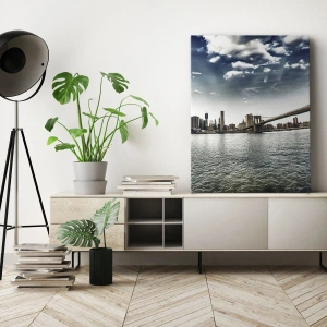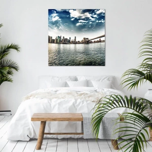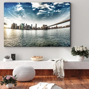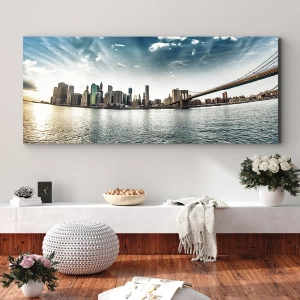 Obraz na płótnie - Panorama miasta z mostem na tle błękitnego nieba - 160x50cm - Szklana wyspa - Nowoczesna dekoracja ścienna do salonu i sypialni ARTTOR