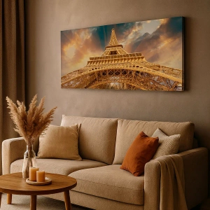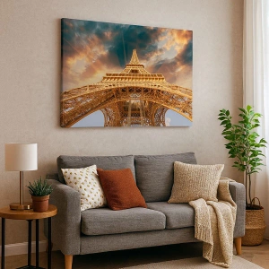 Obraz na płótnie - Wieża Eiffla z perspektywy dolnej na tle zachodzącego słońca - 120x80cm - Jak ludzkość sięgnęła nieba - Nowoczesna dekoracja ścienna do salonu, kuchni i sypialni ARTTOR