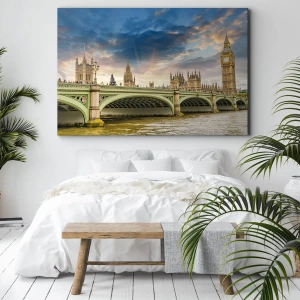 Obraz na płótnie - Big Ben i Westminster Bridge na tle nieba o zmierzchu - 100x70cm - Czas stanął w Imperium - Nowoczesna dekoracja ścienna do salonu, kuchni i sypialni ARTTOR