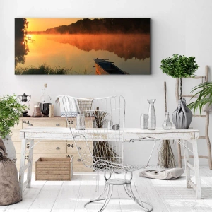 - Obraz przedstawiający poranek nad rzeką, z łódką i mgłą unoszącą się nad wodą w ciepłych promieniach wschodzącego słońca. Idealny do wnętrz, które mają wprowadzać harmonię i bliskość natury.
