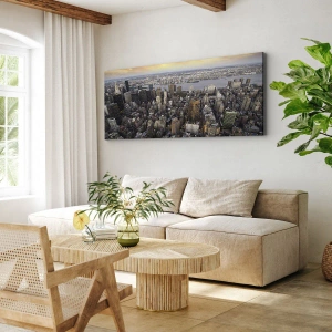 - Obraz przedstawia panoramiczny widok na nowoczesne miasto o zachodzie słońca. Wieżowce, przestronne ulice i gra światła podkreślają urok metropolii. Idealny jako dekoracja do wnętrz w stylu nowoczesnym.