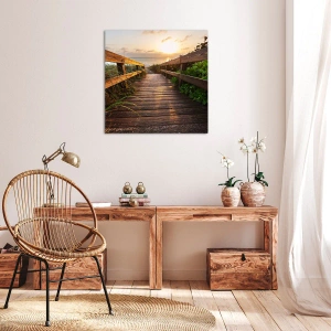 Obraz na płótnie - Drewniany pomost prowadzący na plażę o zachodzie słońca - 140x50cm - I wprost nad brzeg - Nowoczesna dekoracja ścienna do salonu i sypialni ARTTOR