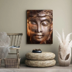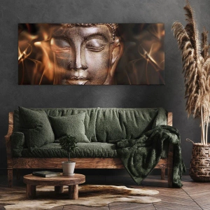 Obraz na płótnie - Posąg Buddy wśród płomieni o złotych odcieniach - 120x50cm - Istnieje tylko tu i teraz - Nowoczesna dekoracja ścienna do salonu i sypialni ARTTOR
