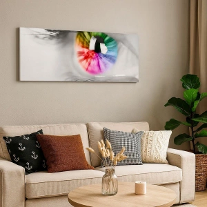 - Obraz przedstawia artystyczne ujęcie oka z tęczową tęczówką na szarym tle. Idealny dla wnętrz inspirowanych nowoczesnością i kreatywnym stylem.