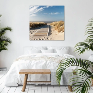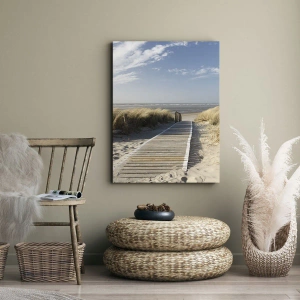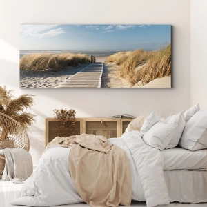Obraz na płótnie - Drewniana ścieżka prowadząca przez wydmy do spokojnego morza - 120x50cm - Za wydmą, w szumie traw - Nowoczesna dekoracja ścienna do salonu i sypialni ARTTOR