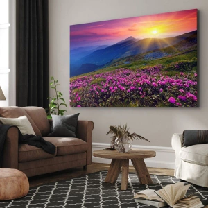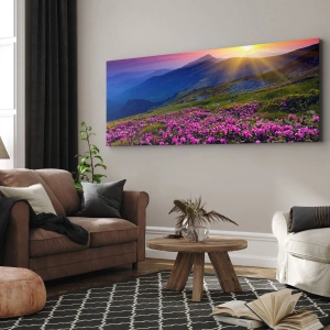 Obraz na płótnie - Kwitnąca łąka z widokiem na góry podczas zachodu słońca - 160x50cm - … A dokoła pachnie kosodrzewina i wonieją zioła - Nowoczesna dekoracja ścienna do salonu i sypialni ARTTOR