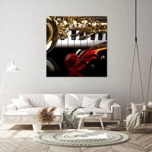 Obraz na ścianę - Blacha, drewno i kość słoniowa - Złoty saksofon, klawisze fortepianu i czerwona skrzypce