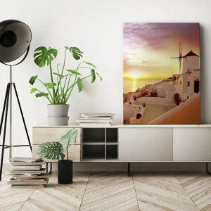 - Zachwycający widok na Santorini z wiatrakiem oświetlonym ciepłym blaskiem zachodzącego słońca. Idealna dekoracja dla miłośników śródziemnomorskiego klimatu.