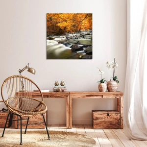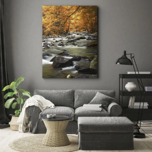 Obraz na płótnie - Strumień w jesiennym lesie otoczony złotymi liśćmi - 120x50cm - Potok w złotym lesie - Nowoczesna dekoracja ścienna do salonu i sypialni ARTTOR