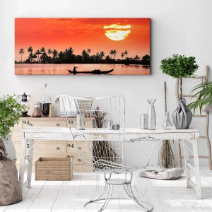 Obraz na płótnie - Tropikalny zachód słońca z łodzią na tle palm - 140x50cm - Spokój tropików o zachodzie - Nowoczesna dekoracja ścienna do salonu i sypialni ARTTOR