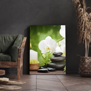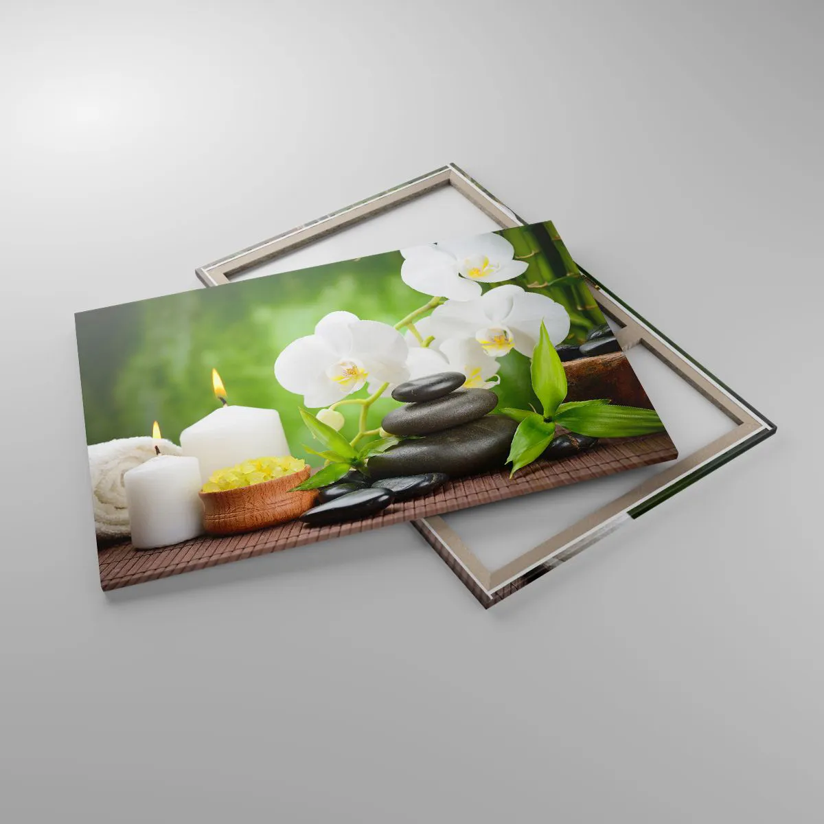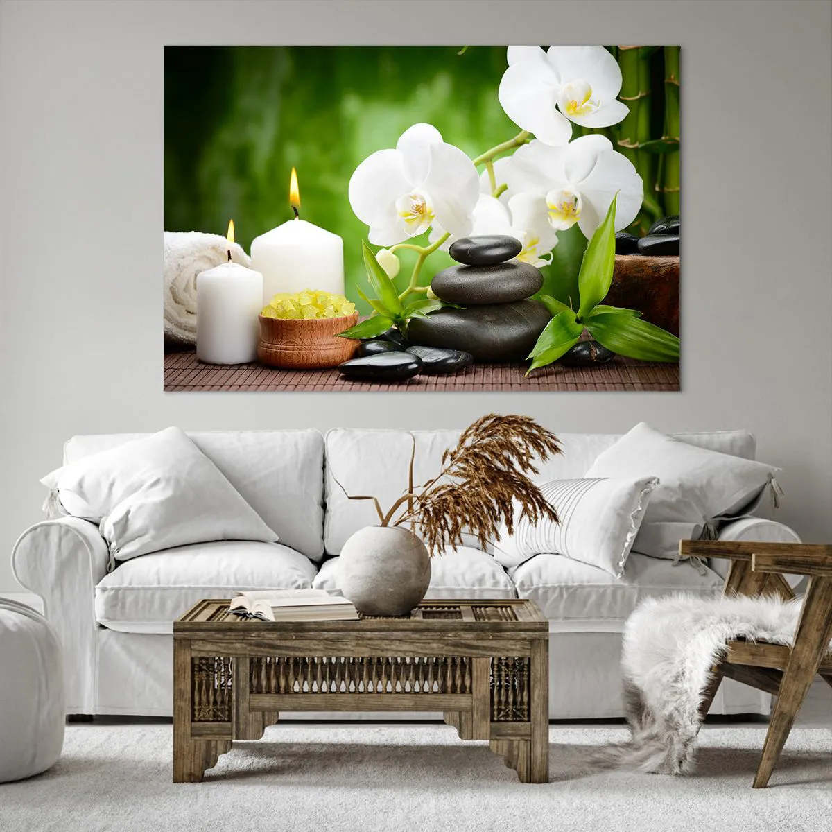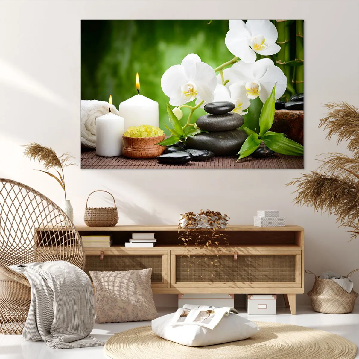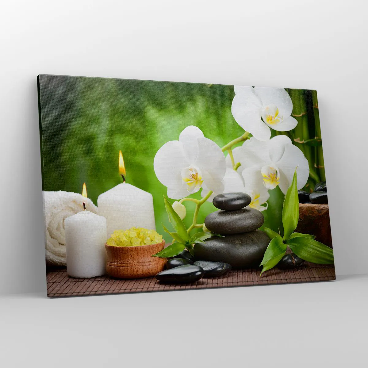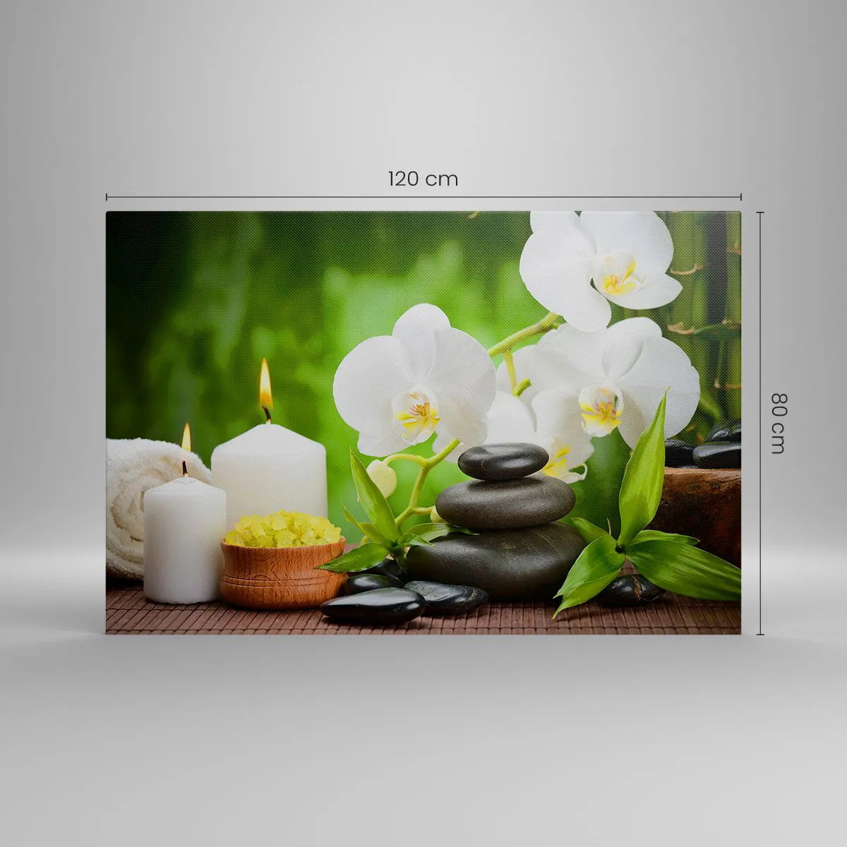 Obraz na płótnie - Orchidee, świece i kamienie w otoczeniu natury - 120x80cm - Wonny, kwiatowy, delikatny dotyk - Nowoczesna dekoracja ścienna do salonu, kuchni i sypialni ARTTOR