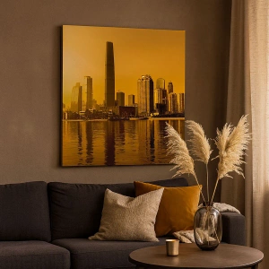 "Złote miasto" to wyjątkowy obraz ukazujący miejską panoramę o zachodzie słońca, z dominującymi wieżowcami i ich odbiciem w spokojnej tafli wody. Złoty odcień zachodzącego słońca nadaje kompozycji ciepła i elegancji, podkreślając nowoczesny charakter architektury. Przelatujący samolot dodaje obrazowi dynamiki i perspektywy, oddając esencję życia w metropolii.