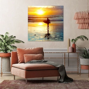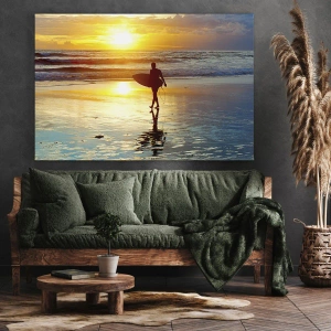 Obraz na płótnie - Surfer idący po plaży o zachodzie słońca z deską w ręku - 120x50cm - Powrót wojownika - Nowoczesna dekoracja ścienna do salonu i sypialni ARTTOR