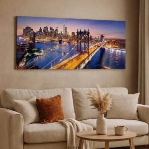 Zdjęcie utrzymane w ciepłych barwach zachodu słońca idealnie oddaje atmosferę Nowego Jorku. Oświetlenie podkreśla detale mostu, a dynamiczne linie konstrukcji prowadzą wzrok w stronę rozświetlonej panoramy miasta.