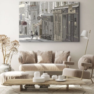 Obraz na płótnie - Ilustracja ulicy miejskiej z kawiarniami i sklepami - 120x80cm - Miejskie radości - Nowoczesna dekoracja ścienna do salonu, kuchni i sypialni ARTTOR