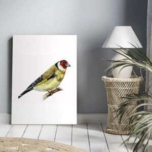 Obraz na płótnie "Ptasi portret" przedstawia urokliwego ptaka z czerwonym łebkiem, siedzącego na delikatnej gałęzi. Jego naturalne barwy - żółty, czerwony i czarny - kontrastują z jasnym, minimalistycznym tłem, podkreślając piękno motywu. Wykonany w stylu akwarelowym, obraz łączy w sobie subtelność i artystyczny wyraz, który przyciąga wzrok.
