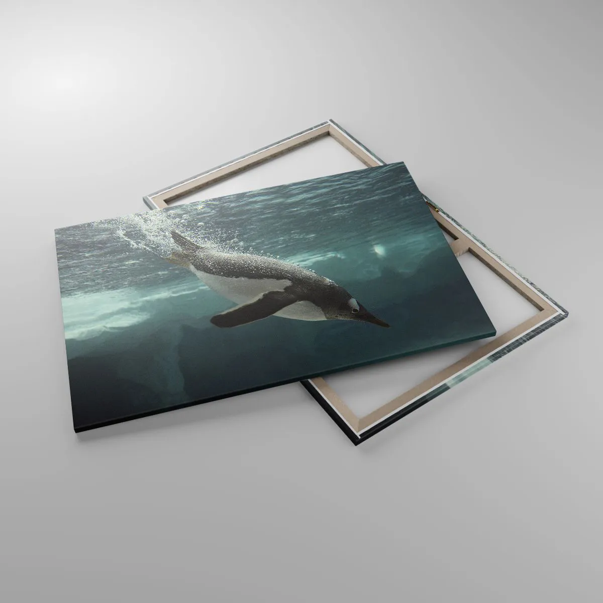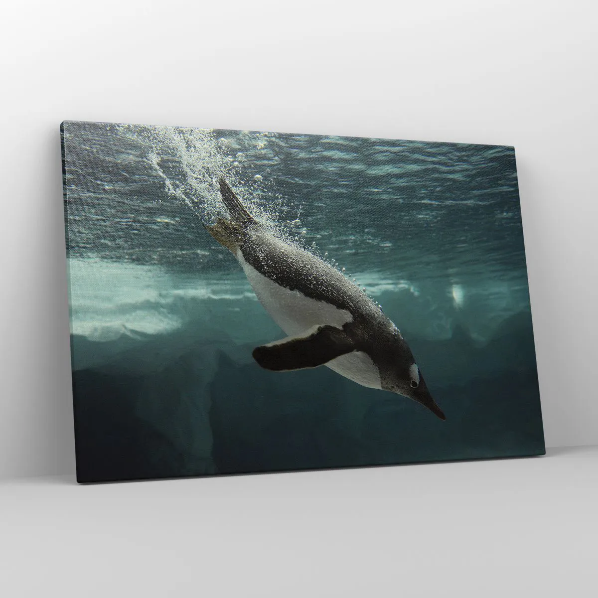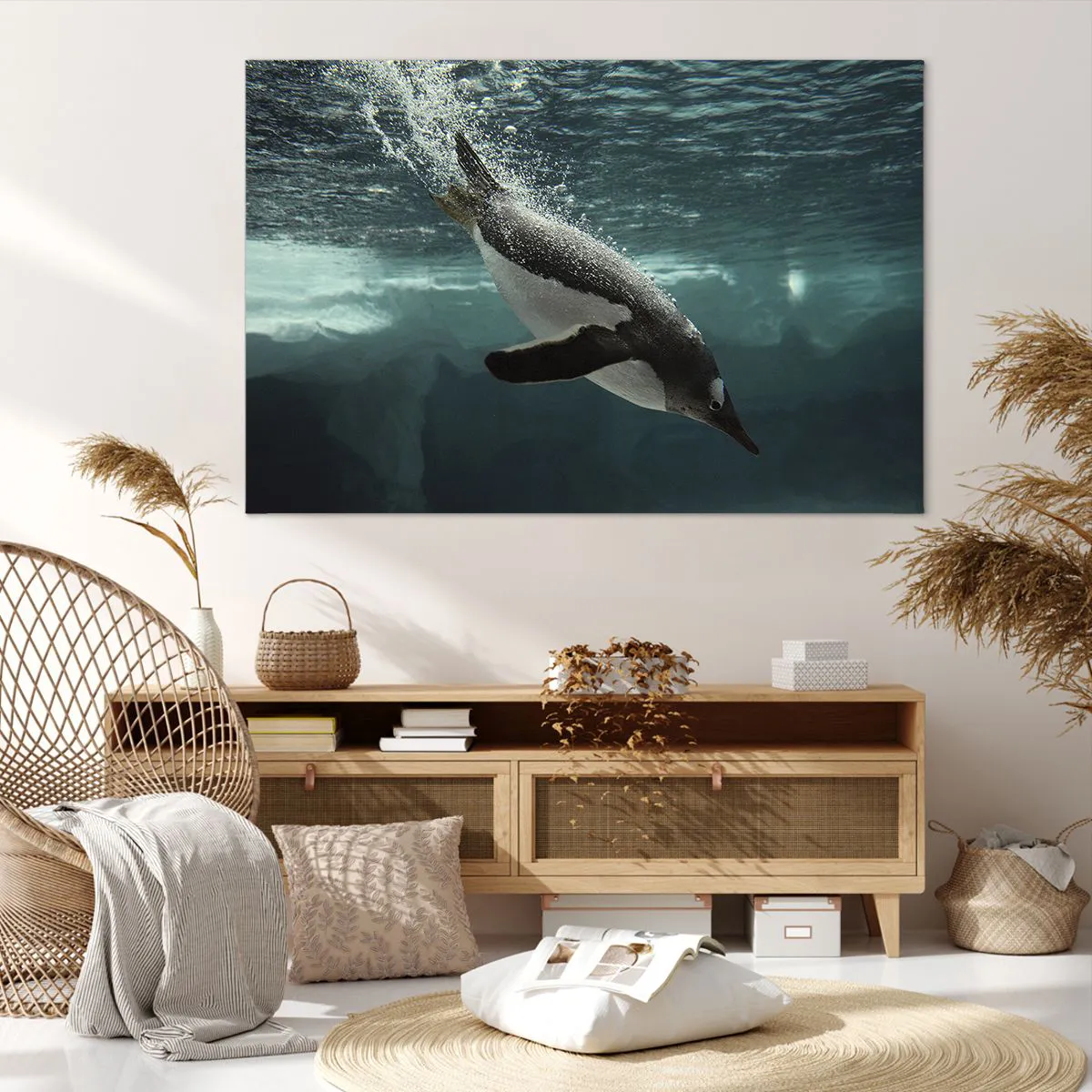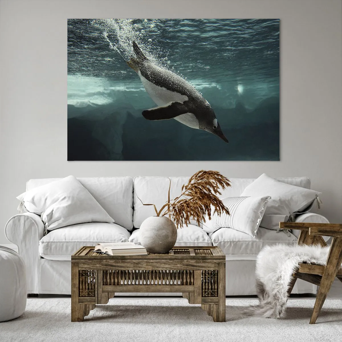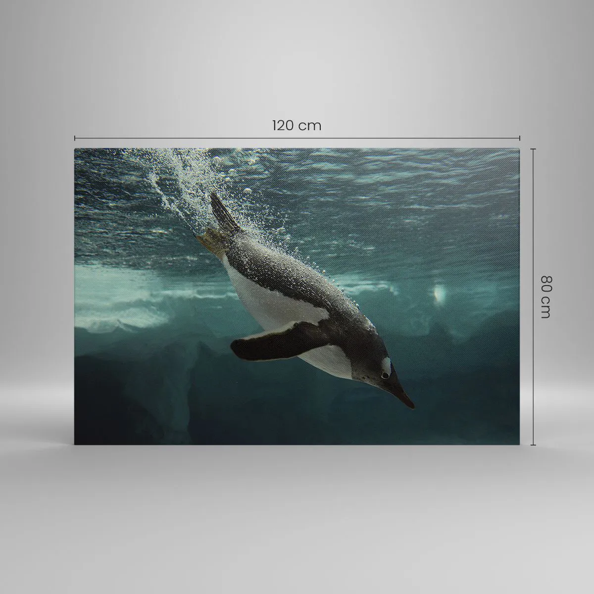 Obraz na płótnie - Pingwin nurkujący w głębinach lodowej wody - 120x80cm - Witaj w moim świecie - Nowoczesna dekoracja ścienna do salonu, kuchni i sypialni ARTTOR