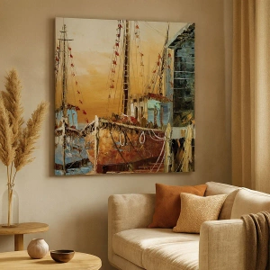 Obraz na płótnie - Łodzie przy brzegu w ciepłym świetle zachodu słońca - 100x70cm - Spokojny powrót - Nowoczesna dekoracja ścienna do salonu, kuchni i sypialni ARTTOR