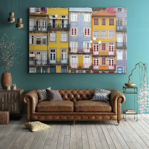 - Obraz na płótnie przedstawiający kolorowe fasady kamienic z detalami architektonicznymi w miejskim krajobrazie. Żywe barwy i szczegółowość obrazu wprowadzają energię i styl do każdego wnętrza.