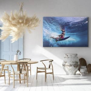 - Dynamiczny obraz przedstawiający surferkę pod wodą w otoczeniu błękitnych fal. Scena pełna energii i harmonii, idealna do nowoczesnych wnętrz.