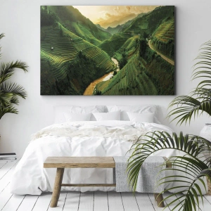 - Obraz przedstawiający malownicze tarasy ryżowe w zielonej dolinie oświetlone zachodzącym słońcem. Idealna dekoracja wnosząca harmonię i egzotyczny klimat do wnętrz.
