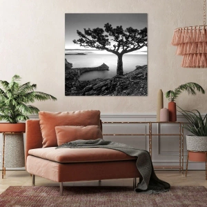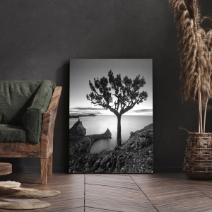 - Obraz przedstawiający czarno-biały krajobraz z samotnym drzewem na klifie nad morzem. Dekoracja wprowadzająca spokój i harmonię do wnętrz.