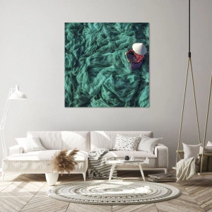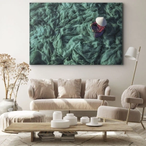 • Obraz na płótnie 70x50 cm przedstawiający osobę z kapeluszem otoczoną zielonymi sieciami rybackimi. Egzotyczny motyw doskonale pasujący do wnętrz inspirowanych naturą i tradycją.