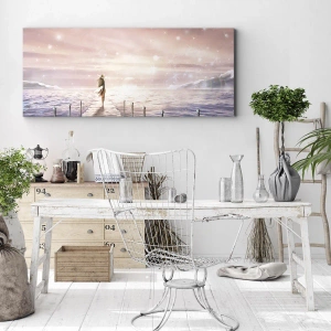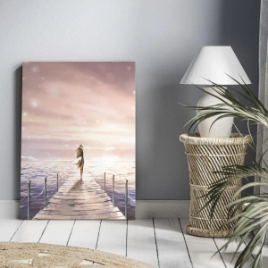 Obraz emanuje spokojem i harmonią, wprowadzając do wnętrza atmosferę relaksu i wyciszenia. Motyw kobiety na pomoście, skierowanej w stronę horyzontu, symbolizuje nadzieję, kontemplację i chwilę refleksji nad pięknem otaczającego świata.