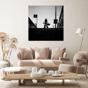 - Czarno-biały obraz przedstawiający kobiecą sylwetkę na schodach, tworząc dynamiczny klimat miejskiej sceny. Idealna dekoracja do nowoczesnych wnętrz pełnych stylu i minimalizmu.