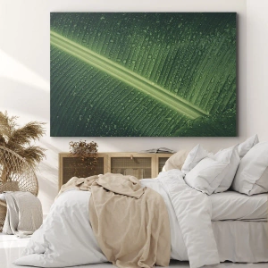 Obraz na płótnie - Zielony liść z kroplami wody na powierzchni - 140x50cm - Struktura zieleni - Nowoczesna dekoracja ścienna do salonu i sypialni ARTTOR