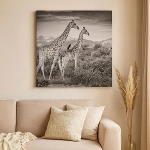 Obraz na płótnie - Czarno-białe sylwetki dwóch żyraf na sawannie - 120x80cm - Wyższe sfery w Afryce - Nowoczesna dekoracja ścienna do salonu, kuchni i sypialni ARTTOR