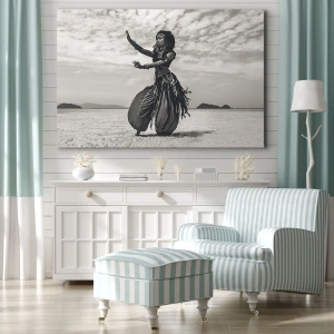 "Taniec południowych wysp" to obraz na płótnie o wymiarach 70x50 cm, który przedstawia egzotyczną tancerkę w dynamicznej pozie na tle pustynnego krajobrazu. Subtelna czarno-biała kolorystyka nadaje kompozycji elegancji i ponadczasowego stylu, podkreślając ruch i lekkość tancerki.