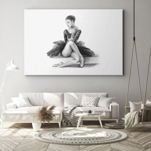 Obraz na płótnie "Zaczarowana tańcem" to wyjątkowe dzieło sztuki, które łączy subtelność z klasycznym pięknem. Na płótnie o wymiarach 70x50 cm w formacie poziomym ukazano baletnicę w pozycji odpoczynku, narysowaną w stylu delikatnego szkicu. Precyzyjne linie oraz subtelne cieniowanie podkreślają elegancję i grację tanecznej postaci.