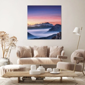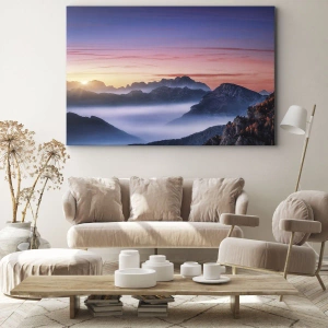 - Obraz na płótnie o wymiarach 70x50 cm przedstawiający górski krajobraz o wschodzie słońca z mgłami w dolinach. Subtelna dekoracja wprowadzająca harmonię i spokój do wnętrza.