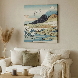 "W japońskim duchu" to unikalny obraz na płótnie o wymiarach 70x50 cm, inspirowany tradycyjną japońską grafiką. Przedstawia malowniczy krajobraz z górami, żurawiami i spokojną rzeką, tworząc harmonijną kompozycję, która wprowadza do wnętrza orientalny klimat i spokój. Subtelne kolory i detale nadają obrazowi wyjątkowy charakter.