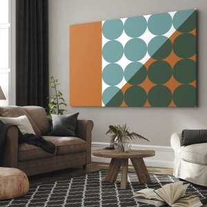 Obraz przyciąga uwagę swoją harmonijną strukturą geometrycznych wzorów oraz odważnym połączeniem barw. Jest to dekoracja, która dodaje wnętrzu energii i nowoczesnego charakteru, jednocześnie zachowując prostotę formy. Idealny do salonów, biur, czy przestrzeni publicznych, gdzie może pełnić rolę centralnego elementu dekoracyjnego.
