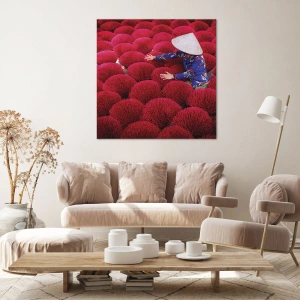 - Obraz na płótnie o wymiarach 70x50 cm ukazujący kobietę w tradycyjnym kapeluszu wśród czerwonych wiązek kadzideł. Wyrazista dekoracja idealna do nowoczesnych i egzotycznych wnętrz.