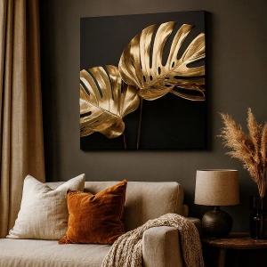 • Obraz przedstawia złote liście monstery na czarnym tle, tworząc elegancką i wyrafinowaną kompozycję. Idealny do wnętrz nowoczesnych, wprowadzając harmonię i styl.