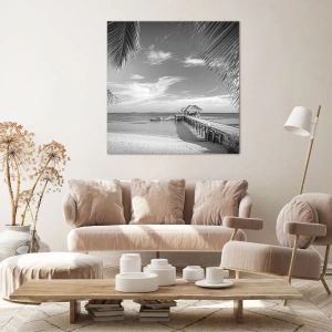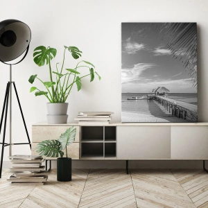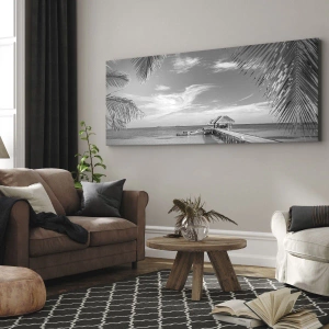 Obraz na płótnie - Czarno-biała plaża z molo i palmami na tropikalnym wybrzeżu - 160x50cm - Wspomnienie czy marzenie? - Nowoczesna dekoracja ścienna do salonu i sypialni ARTTOR