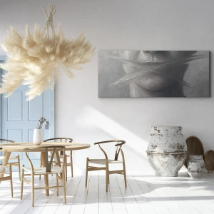 Obraz na płótnie - Symboliczny portret z zamazanymi ustami w szarej tonacji - 160x50cm - Ani słowa - Nowoczesna dekoracja ścienna do salonu i sypialni ARTTOR