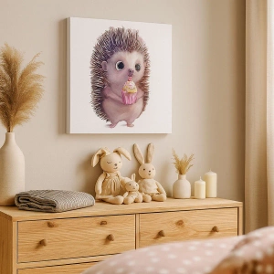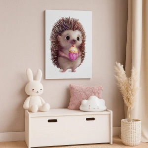 - Obraz na płótnie przedstawiający uroczego jeżyka trzymającego babeczkę na białym tle. Idealny dodatek do pokoju dziecięcego lub przestrzeni, która wymaga ciepłego i przytulnego akcentu.