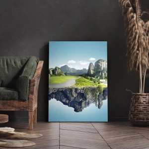 "Fantastyczna wyspa" to obraz na płótnie o wymiarach 70x50 cm, który przedstawia niezwykłą latającą wyspę. Na tej surrealistycznej kompozycji góry, wodospady i zielone przestrzenie łączą się w harmonijną całość, tworząc widok pełen spokoju i inspiracji. Na wyspie znajduje się droga prowadząca przez malownicze tereny, podkreślając fantastyczny charakter krajobrazu.