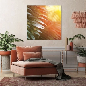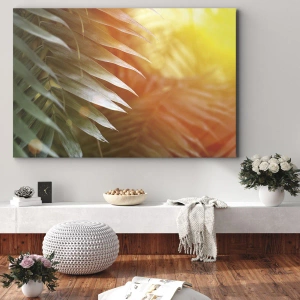 Obraz na ścianę - Poranek w dżungli - Liście palmy w promieniach słońca o zachodzie