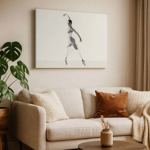 "W teatrze świata" to wyjątkowy obraz na płótnie o wymiarach 70x50 cm w formacie poziomym, przedstawiający baletnicę w dynamicznej pozie, otoczoną geometrycznymi liniami, które nadają całości nowoczesnego i minimalistycznego charakteru. Czarno-biała kolorystyka obrazu w połączeniu z subtelnym tłem podkreśla elegancję i lekkość ruchu baletnicy.