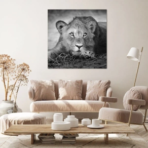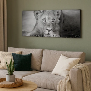 Obraz na płótnie - Monochromatyczny portret leżącego młodego lwa - 120x80cm - Królewskie szczenię - Nowoczesna dekoracja ścienna do salonu, kuchni i sypialni ARTTOR