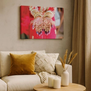 - Obraz przedstawia ozdobione henną dłonie na tle czerwonej sukni. Wzory i detale oddają piękno tradycyjnej sztuki orientalnej, tworząc elegancką i wyrazistą kompozycję idealną do nowoczesnych i klasycznych wnętrz.