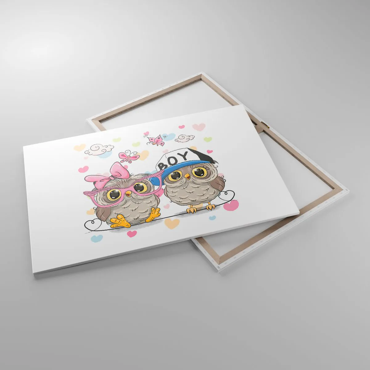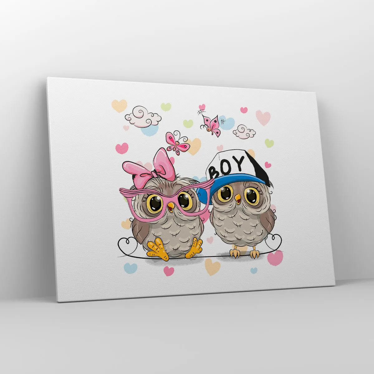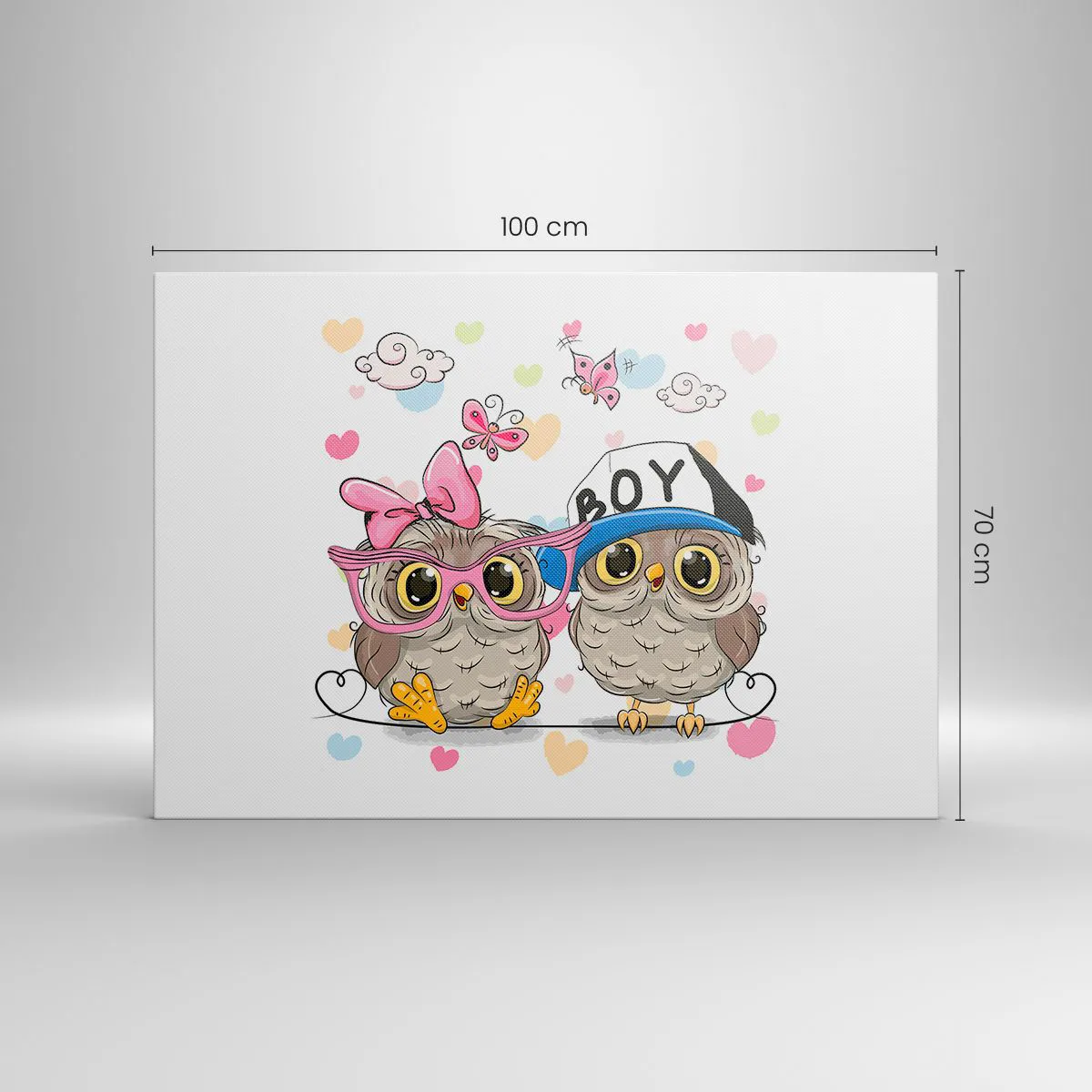 Obraz na płótnie - Dwie urocze sowy w otoczeniu serduszek - 100x70cm - Kochajmy się! - Nowoczesna dekoracja ścienna do salonu, kuchni i sypialni ARTTOR