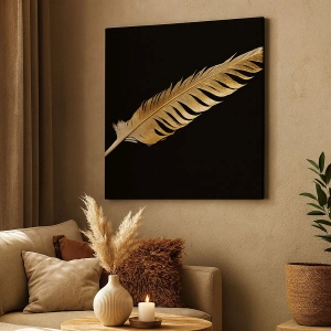 Kontrast między intensywną czernią a połyskującym złotem podkreśla luksusowy charakter obrazu. Detale pióra zostały precyzyjnie oddane, co nadaje całości realistycznego i jednocześnie artystycznego wyglądu. Prostota tej kompozycji sprawia, że obraz idealnie pasuje do nowoczesnych wnętrz o wyrafinowanym stylu.