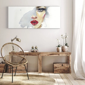 Obraz na płótnie - Portret kobiety w akwarelowym stylu z intensywnym spojrzeniem - 140x50cm - Odbicie w kropli wody - Nowoczesna dekoracja ścienna do salonu i sypialni ARTTOR