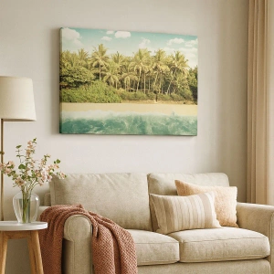 - Tropikalna plaża z palmami i turkusowym morzem. Obraz wprowadza egzotyczny klimat i harmonię do wnętrza.